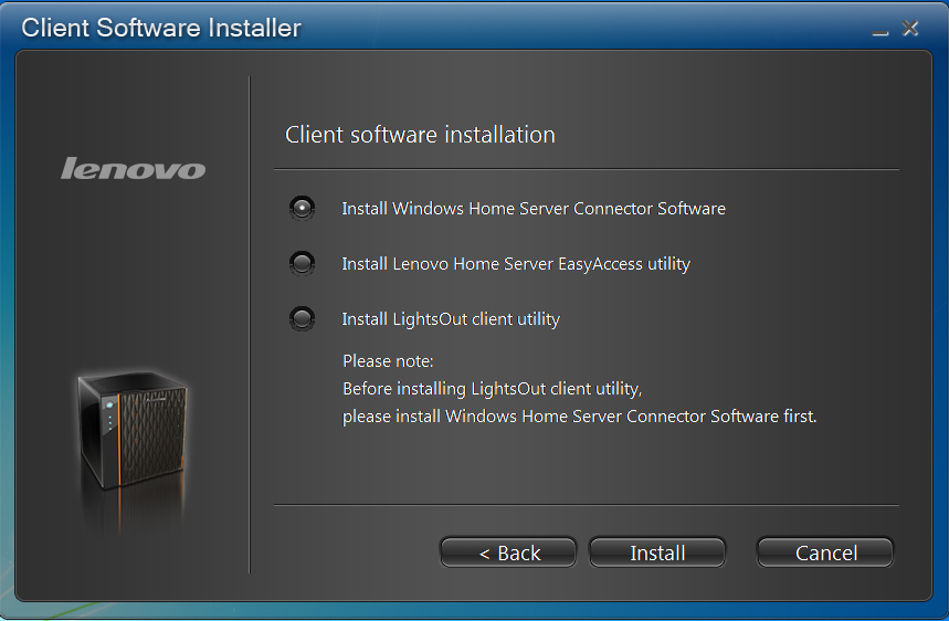 Installation and configuration of the IdeaCentre D400 is fairly straight forward. Put in the Client Connector Software disk, let the installer download the software from the server, answer some questions and you’re all set and ready to go. However, there is one thing that I do not like about Lenovo’s installer. There are three items on the disk (Home Server Connector, LightsOut Client, and Lenovo’s EasyAccess software). Lenovo does not make it clear on the menu of the installer that to install everything, they each have to be installed separately. I think some clarification on the menu would go along way. Either that, or provide some automation where the user selects which of the three to install, and then they are installed in order automatically without further intervention by a user.